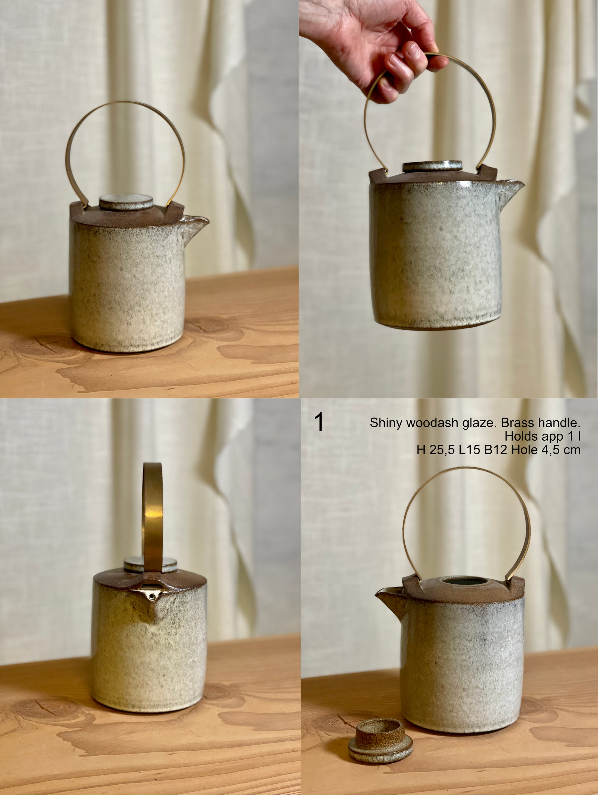 Thekanderne har en metalhank hen over toppen, som giver en fin materialekontrast til keramikken. Hanken er messing, som vil patinere over tid. Kan evt pudses og oliebehandles for et mere skinnende look.