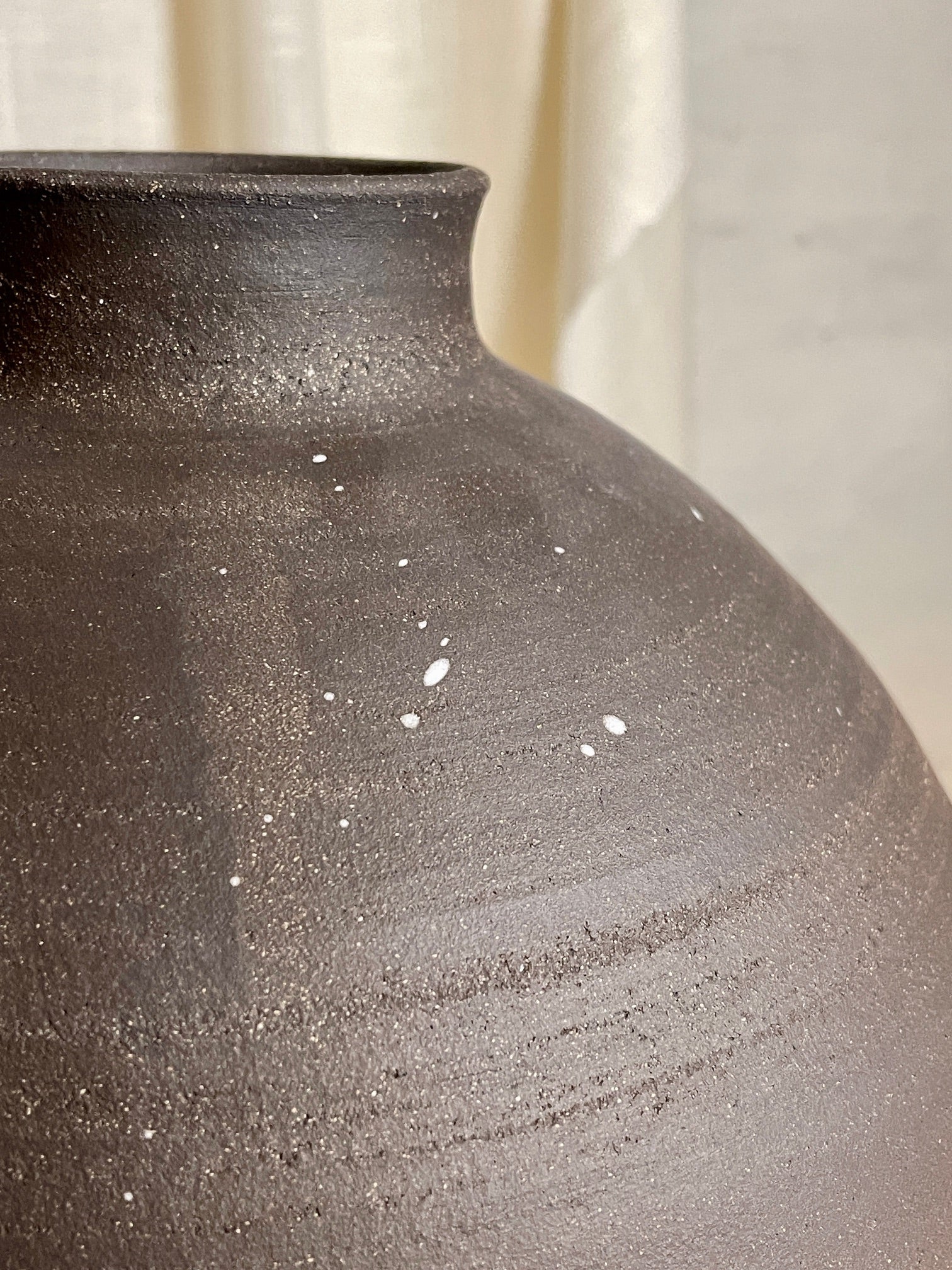 Denne særlige vase er drejet i såkaldt sort ler. Farven er dog i virkeligheden nærmere varm mørk brun. Der lyse korn i leret, kaldet chamotte, som gør leret meget stabilt, samtidig med at det tilfører en fin tekstur. Derudover er der få lette sprøjt af hvid porcelæn ud over overfladen for kontrast.